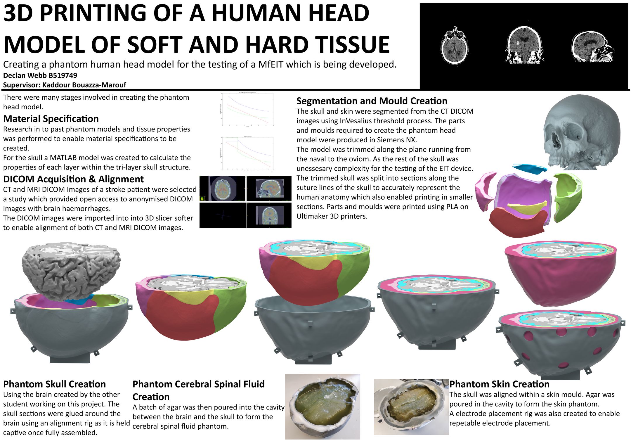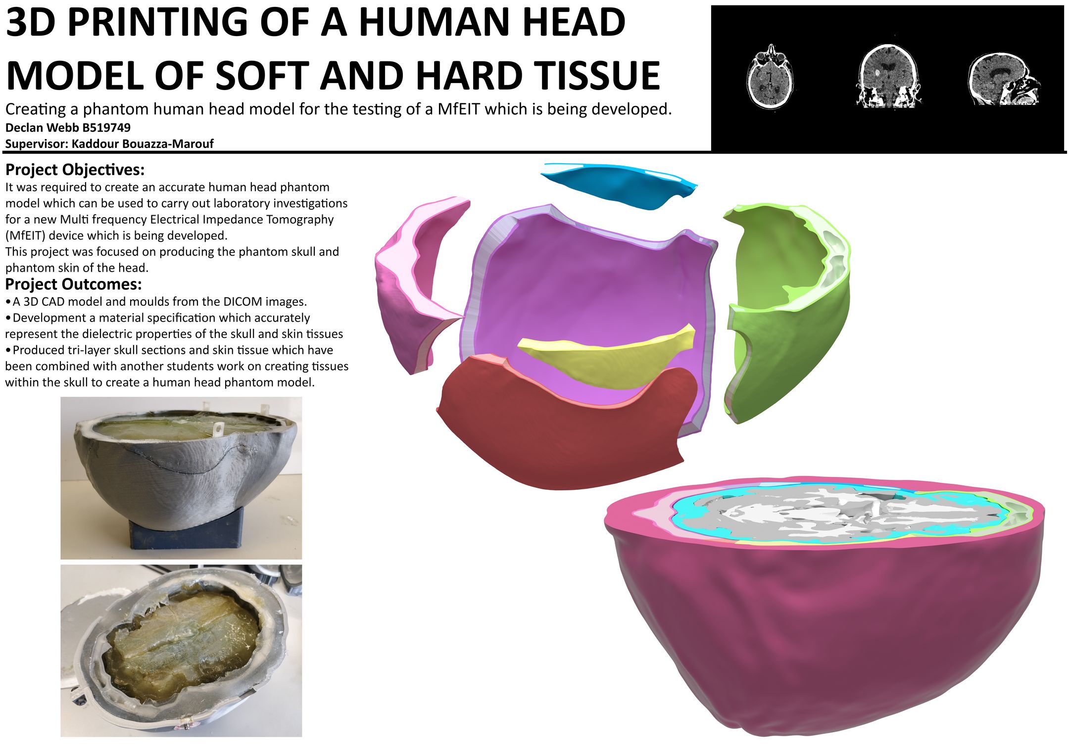 The aim of this project was to use 3D printing to develop a human head model which can be used to carry out laboratory investigations for a new technique of imaging the internal structure of human heads. This technique is called electrical impedance tomography (EIT) which has the advantage of being non-ionising, non-invasive, non-radiating, and portable.