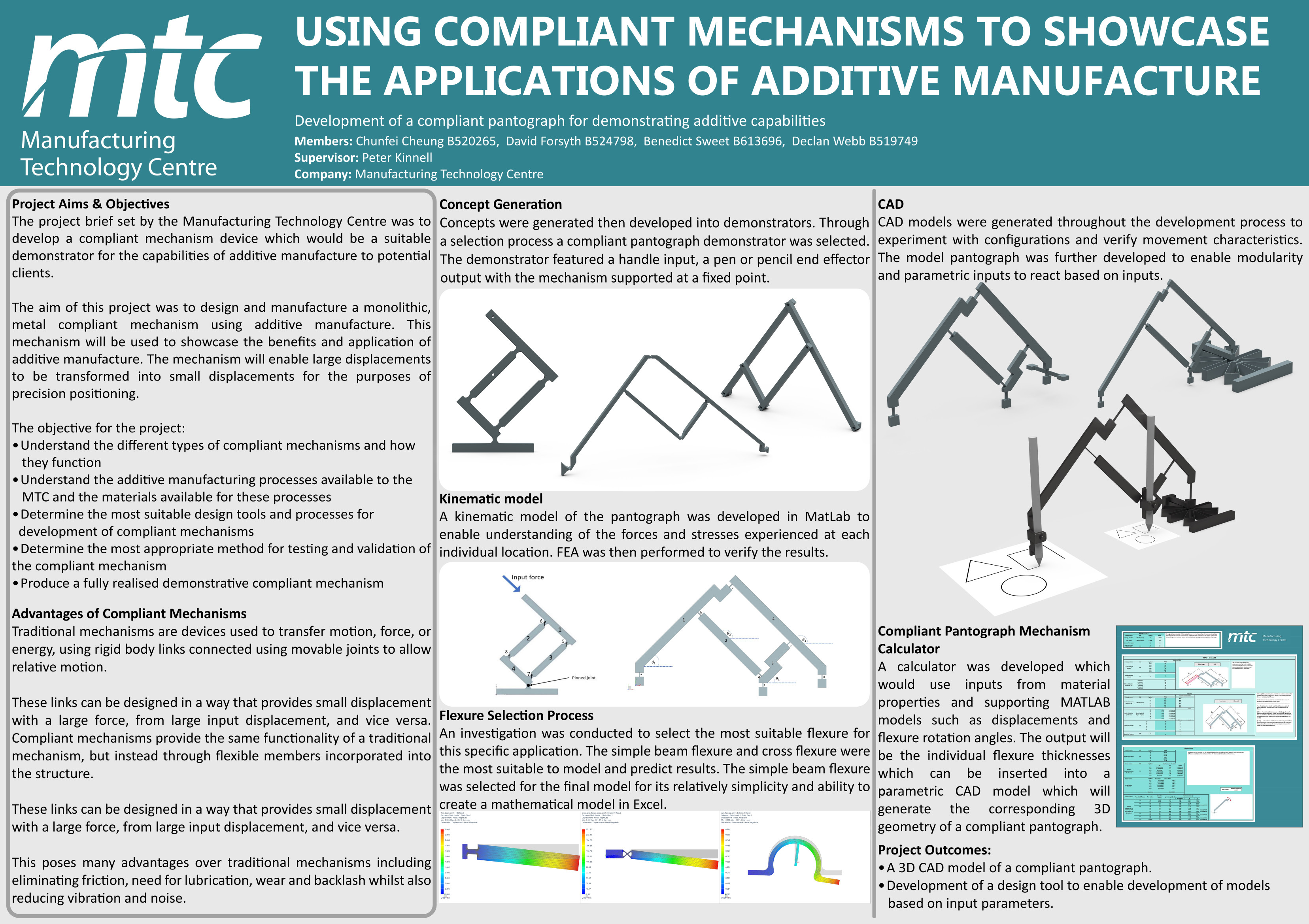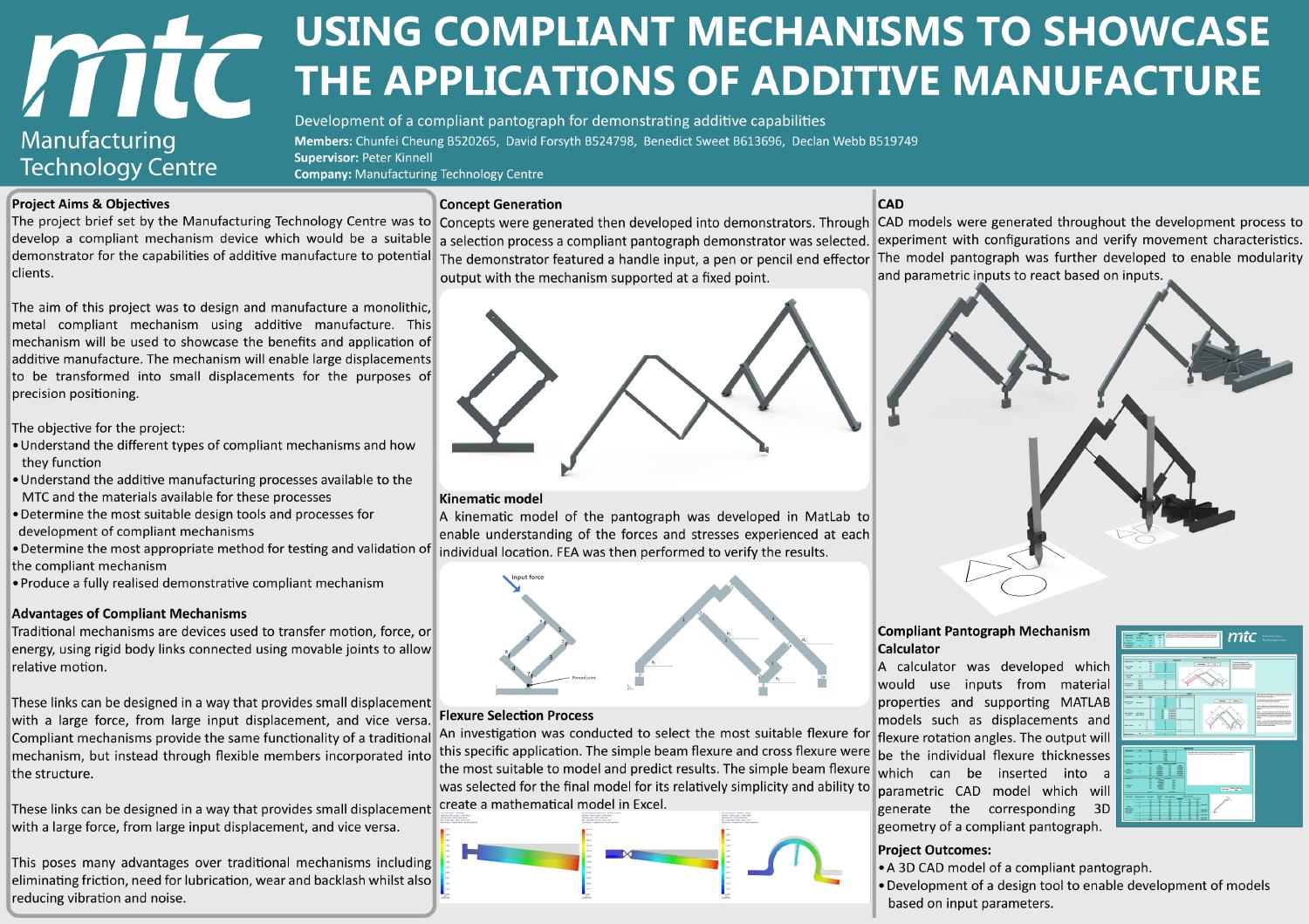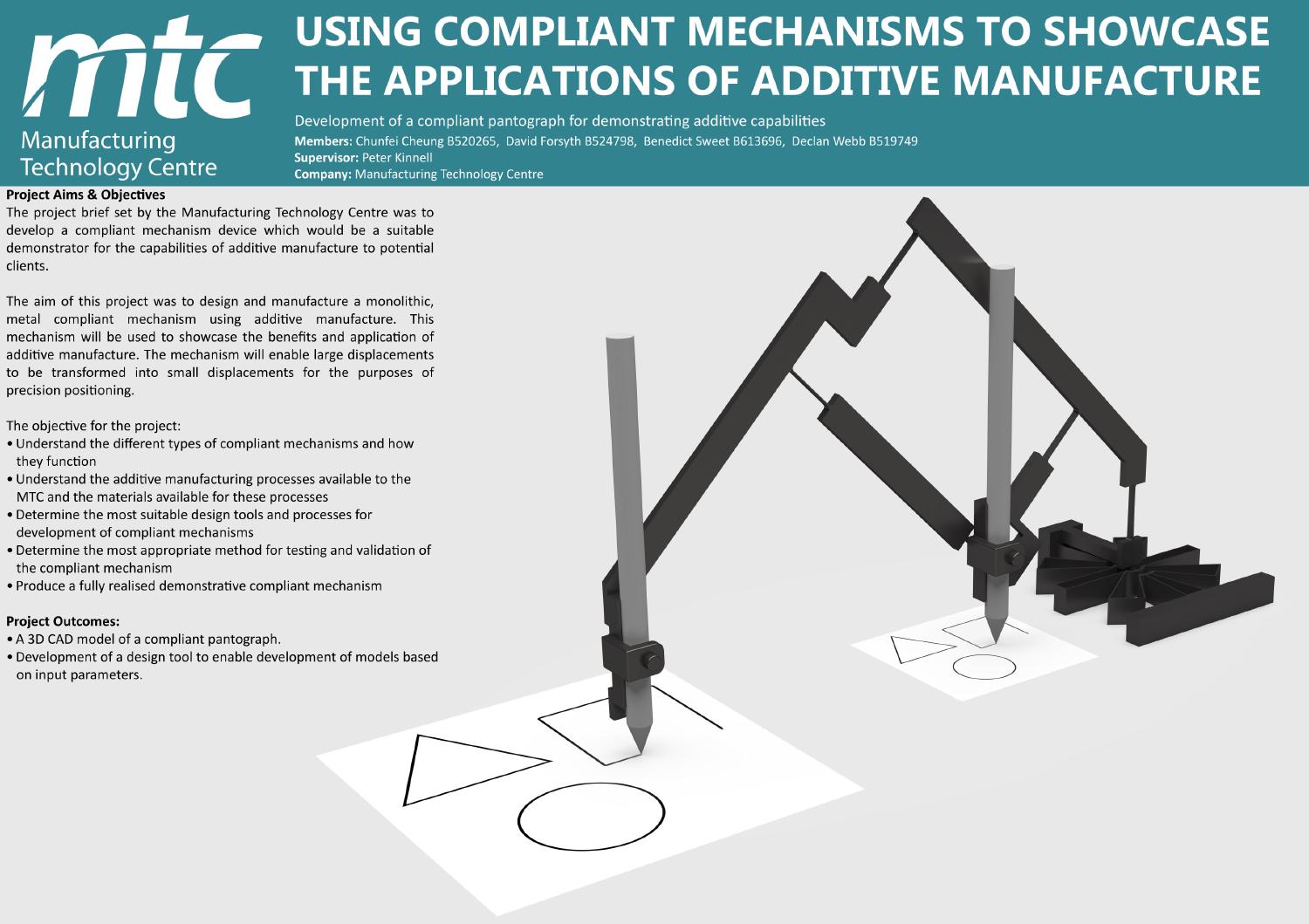 The project brief was set by the Manufacturing Technology Centre (MTC) to develop a compliant mechanism device manufactured using additive manufacture. This mechanism would be a suitable demonstrator for the capabilities of additive manufacture to potential clients.