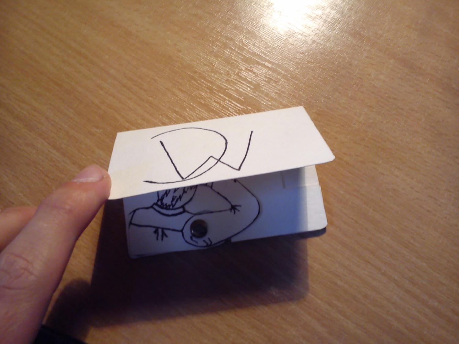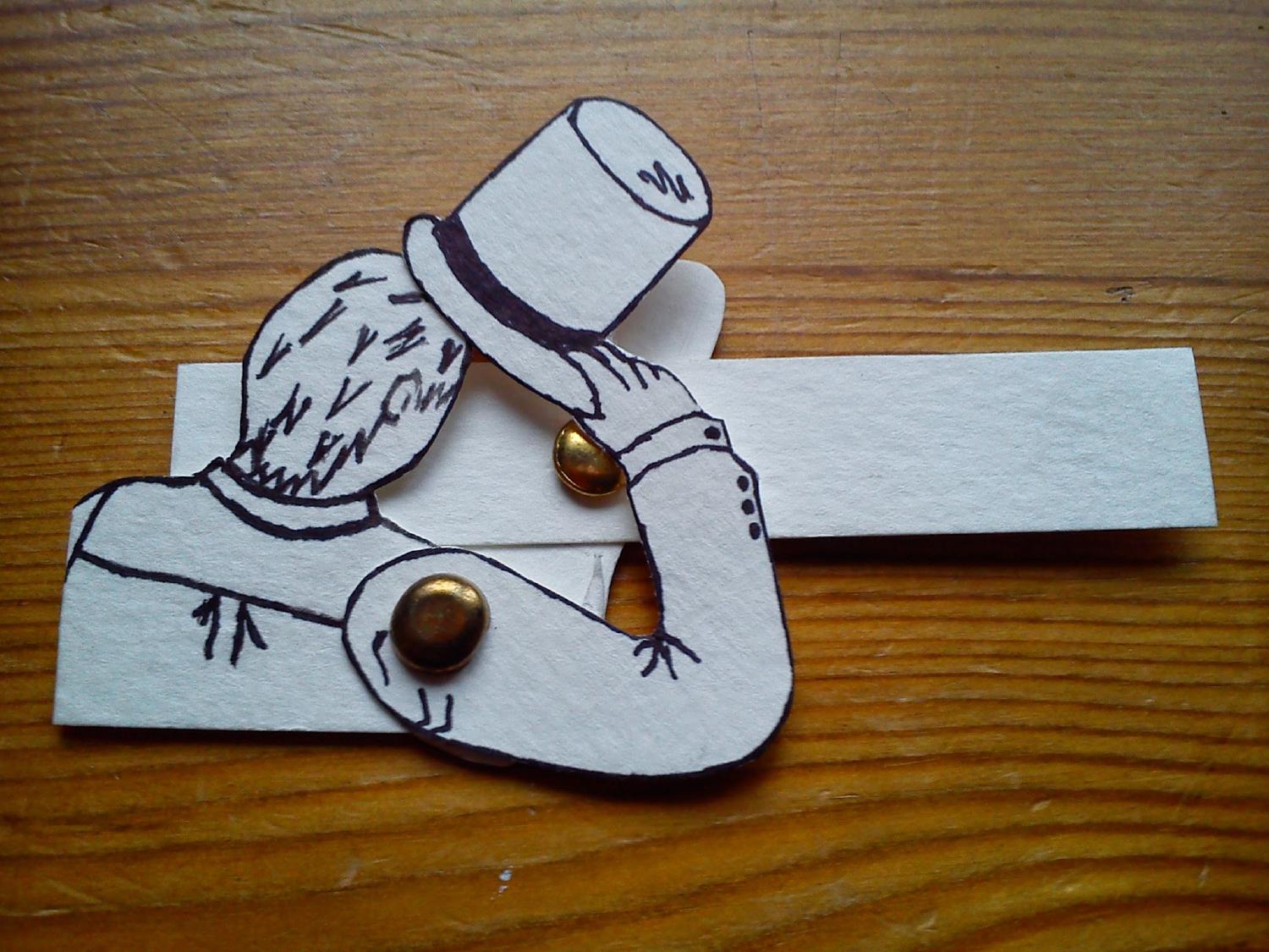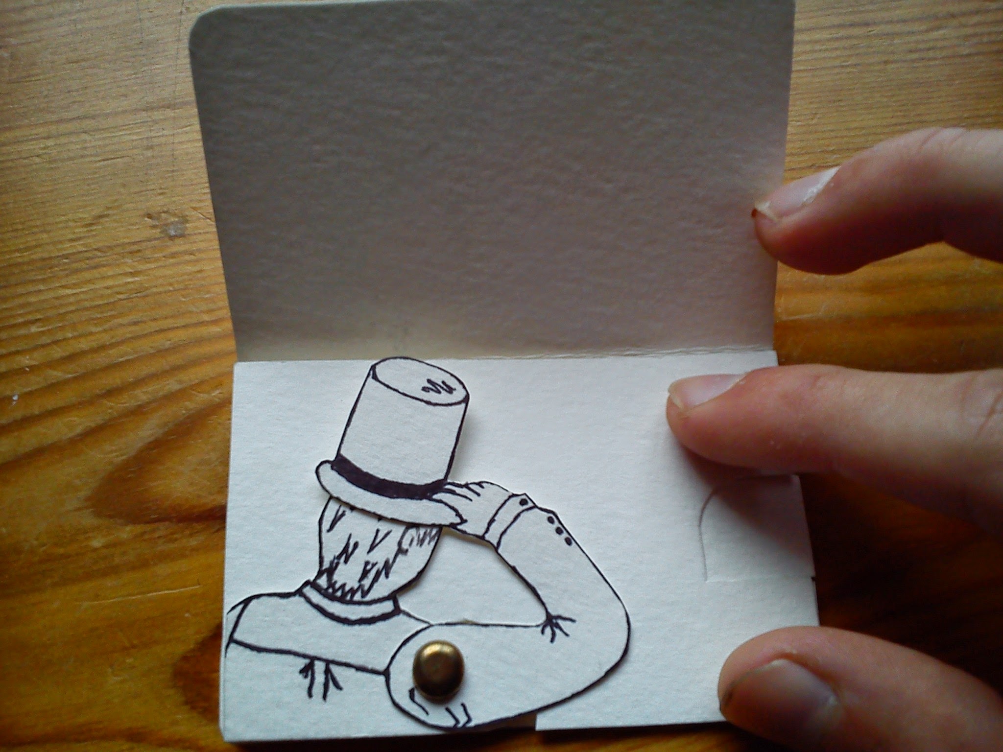 This is my hand made card business card which uses paper mechanics to make it interactive. By pulling the tab the arm with the top hat will move raising the hat off of his head.